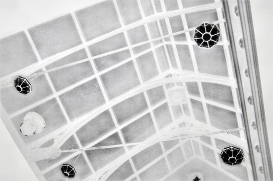 Black and white photographs of the church ceiling are printed in negative to resemble star charts. The grid of exposed rafters map out the 'aerial' space; suspended glass lanterns create constellatory patterns.
